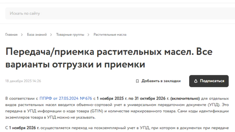 С 1 ноября 2026 года начинается поэкземплярный учет растительных масел и масложировой продукции. Эта информация основывается на Постановлении Правительства РФ от 27.05.2024 № 676. Участники оборота обязаны подавать сведения в систему маркировки о каждой единице товара при приемке, отгрузке и выводе из оборота не по причине розничной продажи.